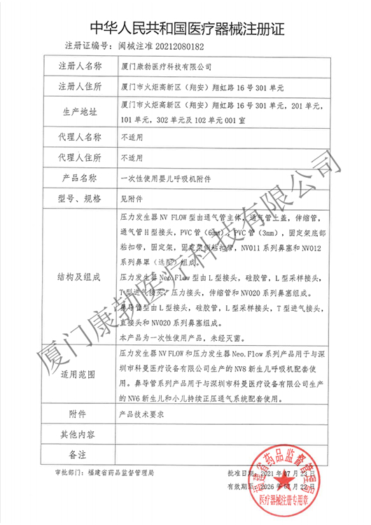 一次性使用嬰兒呼吸機(jī)附件和附件列表及變更文件 產(chǎn)品注冊(cè)證