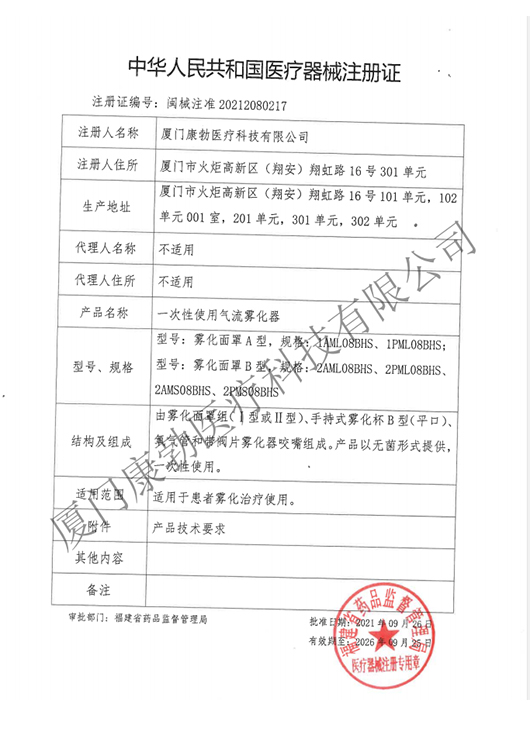 一次性使用氣流霧化器-無菌 產(chǎn)品注冊(cè)證及地址變更文件