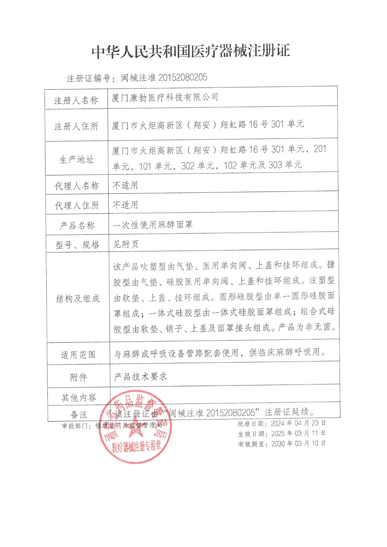 一次性使用麻醉面罩注冊(cè)證