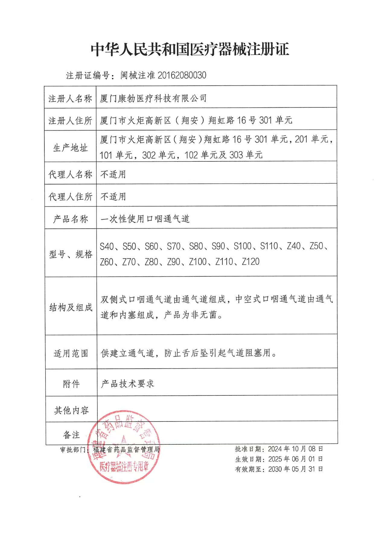 一次性使用口咽通氣道注冊(cè)證